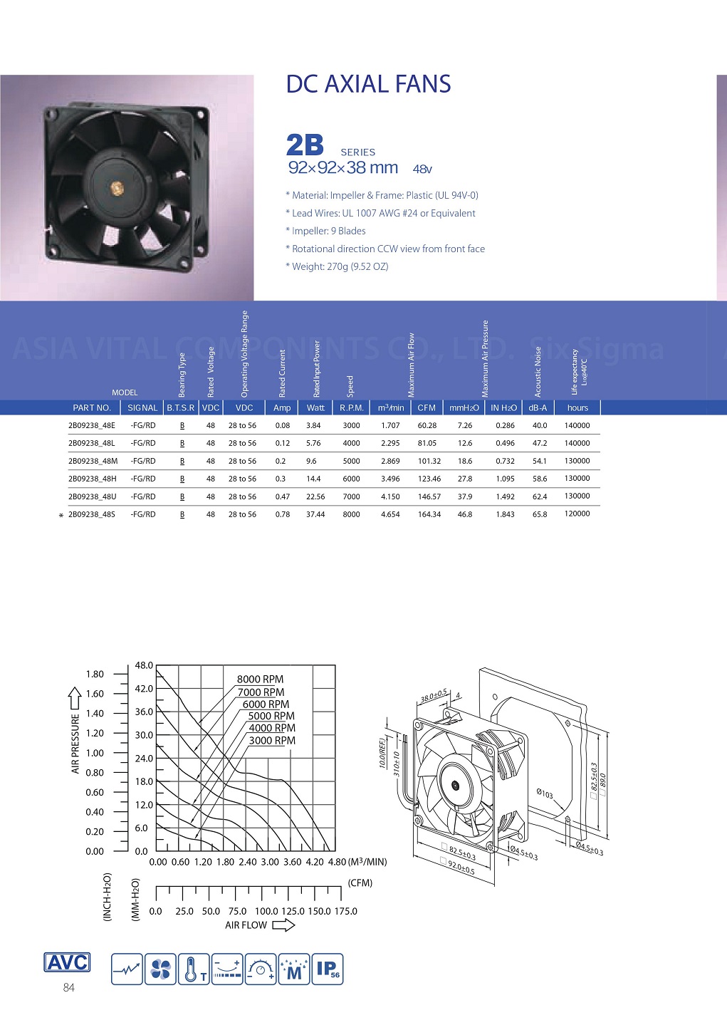 2B09238_48L 电压48V 电流0.12A 功率5.76W 转速4000RPM 风量81.05CFM 静压0.496InchH2O 噪音值47.2dB