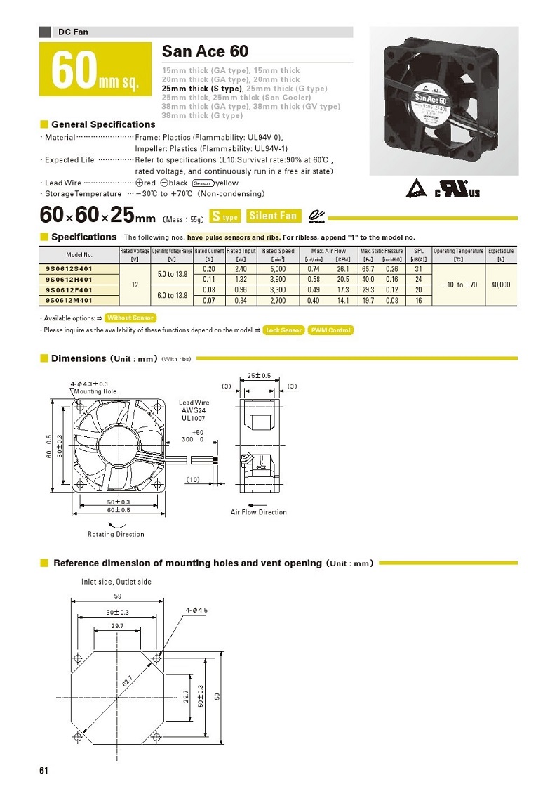 Ace6025 山洋SANYO DENKI静音散热风机,日本San Ace三洋直流散热风扇 SANYO山洋小型轴流风扇, SANYO DENKI三洋冷却风扇 山羊工业风扇 山洋风扇价格,9S06 此款风扇尺寸:60*60*25mm 有运转电压:12V 寿命均达40000H 温度范围:-10-+70度。